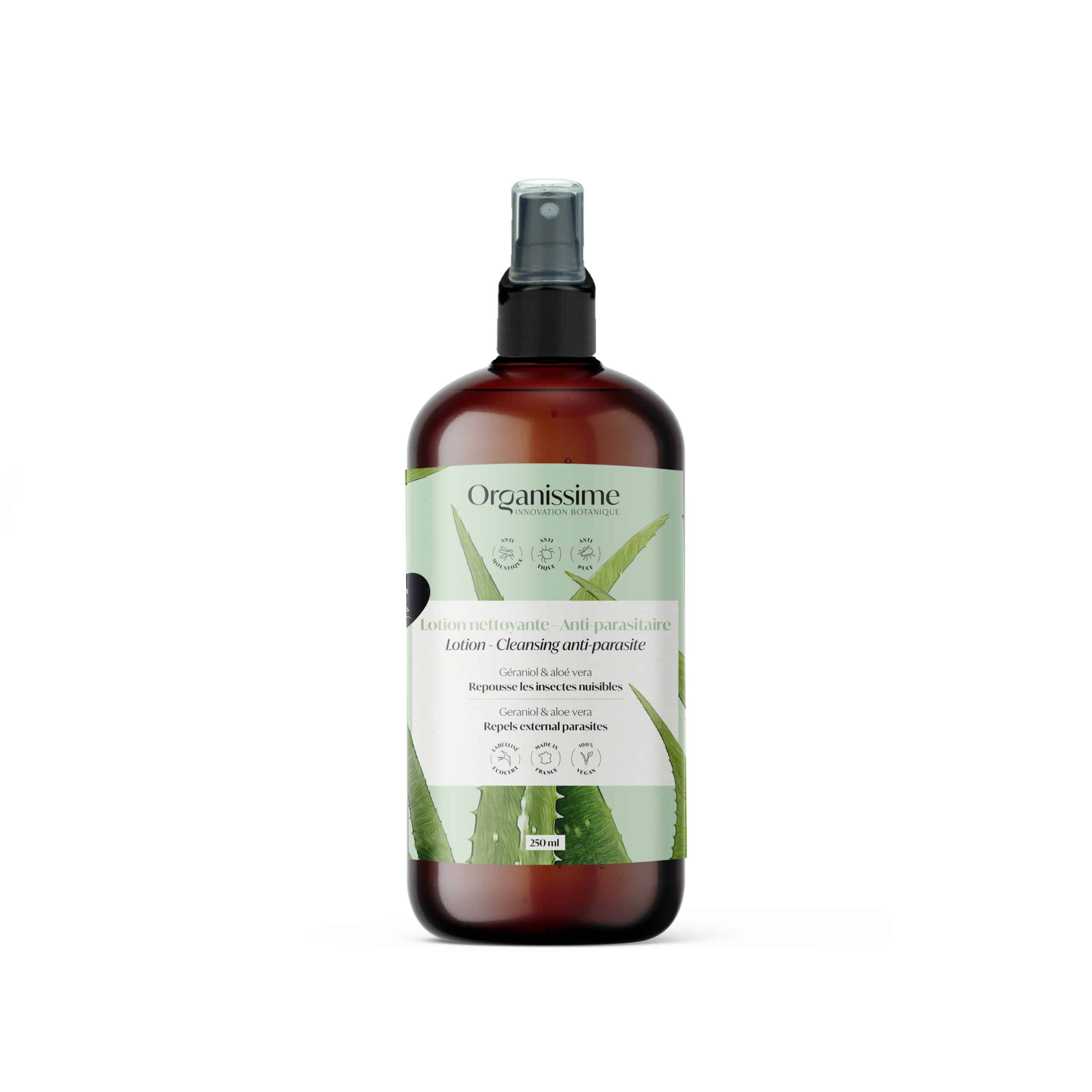 Organissime Anti-parasit lotion er formuleret med aloe vera og geraniol. Takket være disse planters egenskaber renser denne anti-parasit lotion blidt og den kan have en positivt effekt mod at holde lopper, flåter og andre skadelige insekter på afstand af dyret. Samtidig giver produktet god fugt til pelsen.