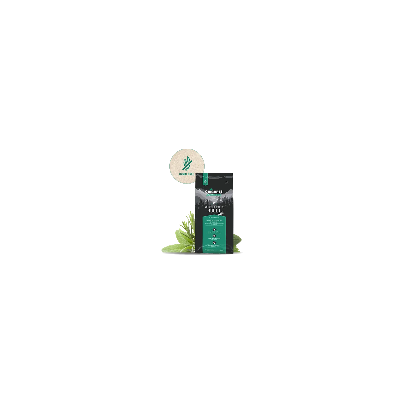 Strudseprotein (tørret 20 %), kartoffelmel (20 %), fjerkræfedt, sød kartoffel (tørrede 8 %), kartoffelflager, ærter (tørret), ærteprotein, tørret roeflis (sukker fjernet), hørfrø (3 %), kartoffelprotein, hydrolyseret protin, gær (tørret 1,5 %), lakseolie (0,5 %), cikorie (tørret 0,2 %) tang (tørret), yucca (tørret), brændenælder (tørret), brombærblade (tørret), røllike (tørret) kamilleblomster (tørret), mistelten (tørret), ensianrod (tørret), tusindgylden/centaury (tørret)