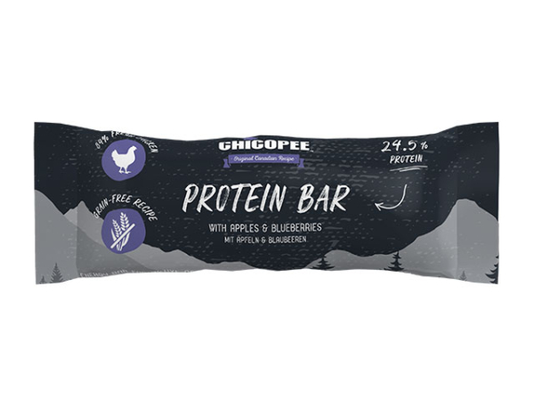 Protein baren er en knasende snack med smag af æble og blåbær, som er velegnet til den aktive hund.