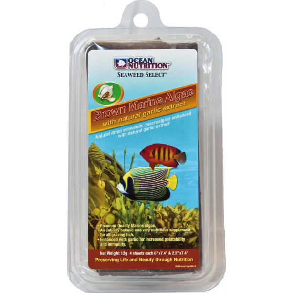 Et helt naturligt, meget nærende tilskud til alle græssende fisk, rigt på C-vitamin og let fordøjeligt. En optimal fødekilde til marine og ferskvands planteædende fisk med blødere munddele. Forstærket med naturligt hvidløgsekstrakt for øget accept af kræsne spisende og understøtte forbedret immunforsvar. Riv et stykke tang af ca. 5 cm gange 7 cm for den gennemsnitlige 200 l fællestank og placer i akvariet ved hjælp af Ocean Nutrition Seaweed Clip. Tillad fisk at græsse i ro og mag. Eventuelle store tangstykker, der bryder løs og flyder til overfladen, skal sættes på igen. Fjern uspist tang efter 24 timer. Optimal fødekilde til alle arter af havtang, engle, leppefisk og nogle sommerfuglefisk. Brune marinealger er et nærende tilskud til alle græssende fisk, rigt på C-vitamin og er 100% fordøjeligt. Dette produkt bør bruges som et supplement til andre fødekilder. Vi anbefaler kraftigt at bruge tang i kombination med Ocean Nutrition Formula Foods (Formula One, Formula Two, Spirulina Formula osv.).