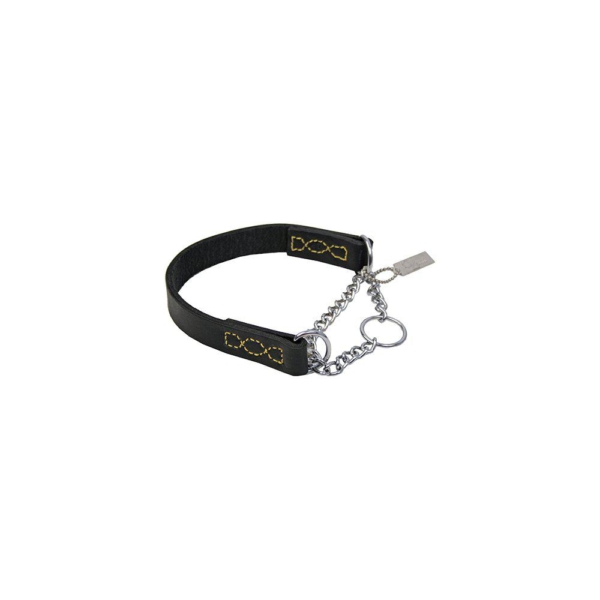 Halv kvæler halsbånd i læder med gule detaljer.