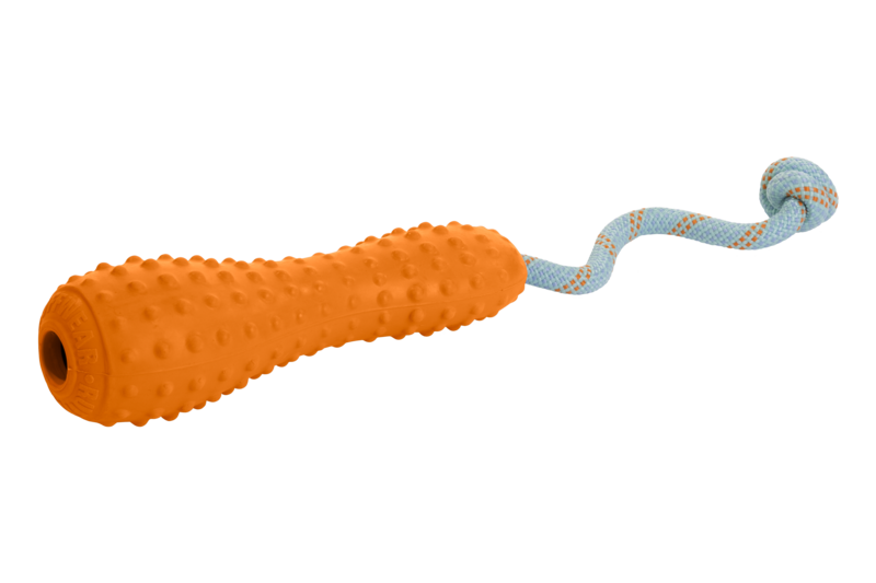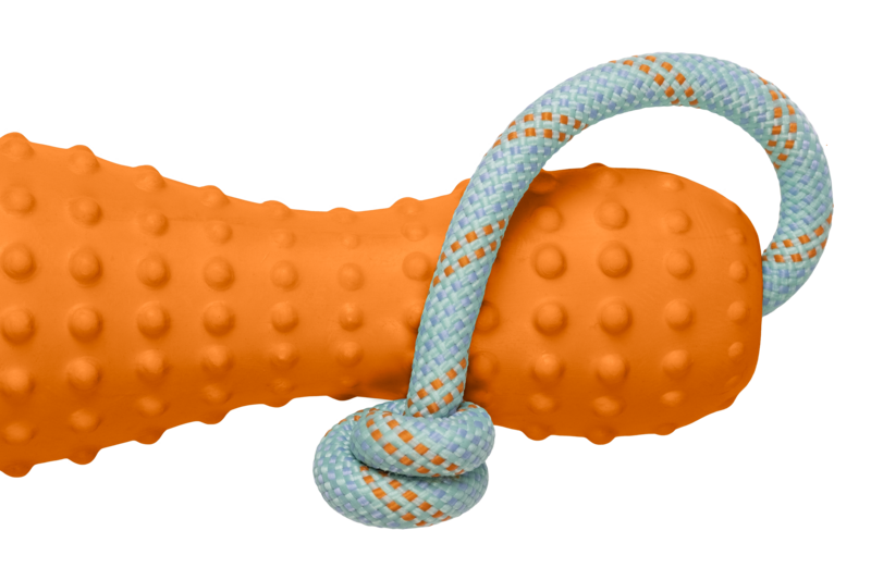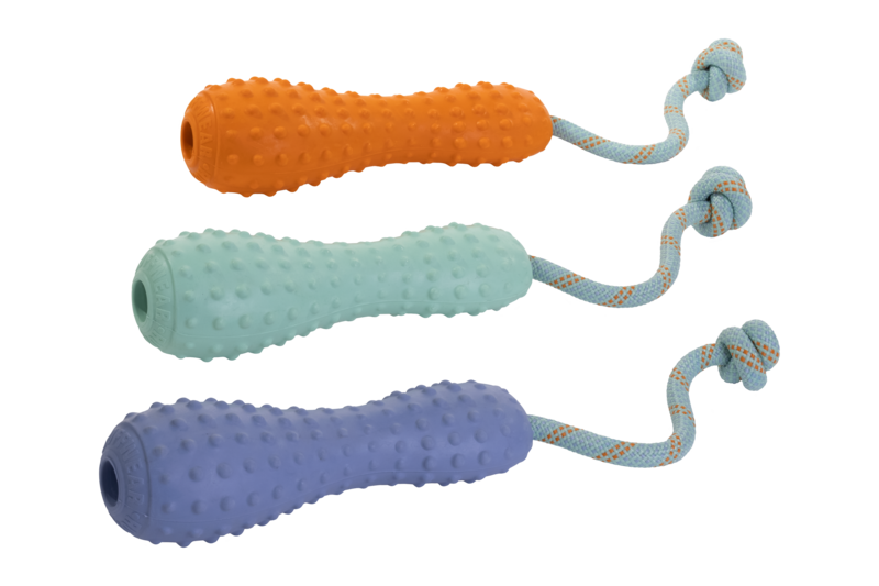 - Legetøj af naturlatex designet til interaktiv leg, både til at trække og kaste.